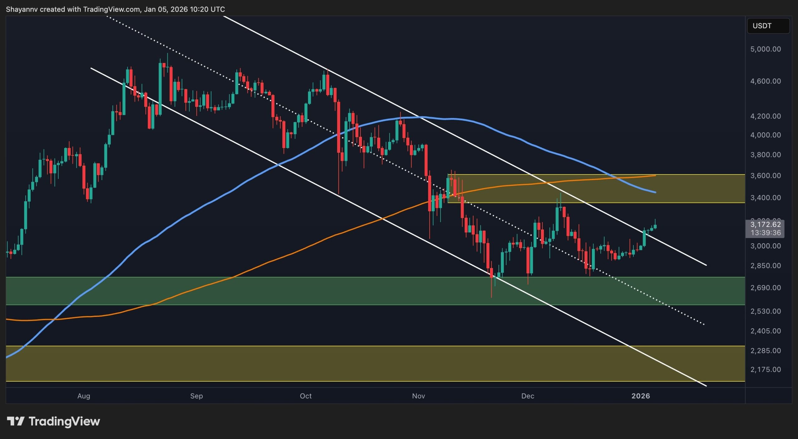 This consolidation alone is not sufficient to signal a bullish continuation. A decisive breakout above the wedge at $3.4K, ideally with strong displacement and acceptance, would be needed to confirm renewed bullish momentum. Until that occurs, the current price action should be treated as range-bound and corrective, with the risk of another rejection remaining elevated if resistance continues to hold.