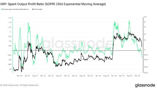 A key indicator supporting this view is the Spent Output Profit Ratio (SOPR), measured using a seven-day Exponential Moving Average (EMA). The SOPR tracks whether coins being moved or sold on the blockchain are being done so at a profit or a loss. Glassnode’s chart shows that XRP’s SOPR declined from about 1.6 in July 2025 to around 0.96 recently.